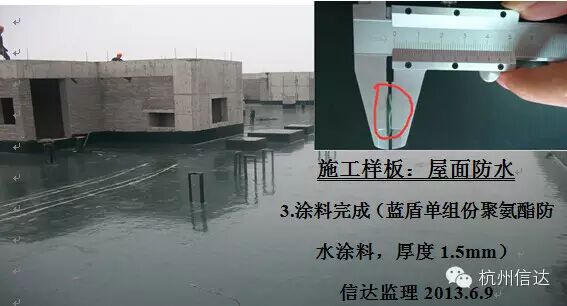 在确保基层坚固,干燥,平整,无杂物时,可进行防水涂料施工。管道边、阴角及水落口等部位应先施工一道附加层,泛水部位涂料上翻高度为250mm,然后开始大面积的施工,从女儿墙的一侧的一角开始均匀涂抹。现场共分三次进行涂抹,第一层要求厚度控制在0.3mm,待完全干燥后,进行第二层的涂抹。第二、三层涂抹厚度控制为0.5mm-0.6mm。施工完成后,进行多处随机取样,厚度均符合要求,不少于设计值的80%,且防水层与基层粘结牢固、结合严密、无起泡、无渗漏。