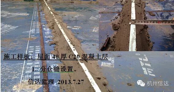 为了防止因温差影响导致找坡层开裂,找坡层应留设分格缝,缝宽为20mm,这是我们现场按照分格缝的设置,进行分块施工。