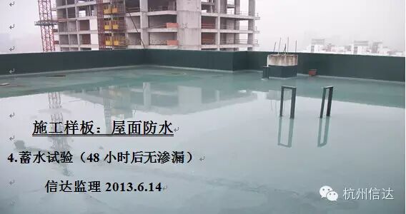 防水涂料施工完成后,需对防水层的防水能力进行检测。我们现场进行的是蓄水试验。一般要求屋面蓄水试验时间不小于24h,我们现场进行的是48h蓄水试验,确保不渗水后进行下一道工序施工。