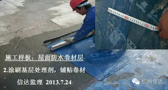 卷材铺贴前,要求先均匀涂刷基层处理剂,干燥后及时铺贴卷材。铺贴时,将底部的隔离膜撕去,缓慢、匀速进行铺贴。用卷轴将底部空气排尽并压实,不得有扭曲、皱折。卷材铺贴时,要求长短边搭接长度≥200px,实际上我们在现场进行检查时,施工方搭接长度都大于250px。