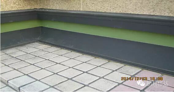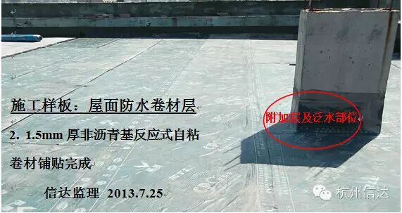 在管道边,阴角及水落口部位应多施工一道附加层,泛水部位上翻高度≥250mm。防水卷材施工完成后,和防水涂料一样,需要进行蓄水试验,无渗漏后方可进行下一道工序施工。