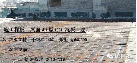 接着进行基层清理,干铺油毛毡作为隔离层,同时也是保护层,保护防水卷材层不被破环。铺设φ6@200双向钢筋网片,钢筋网片在分仓缝部位断开。