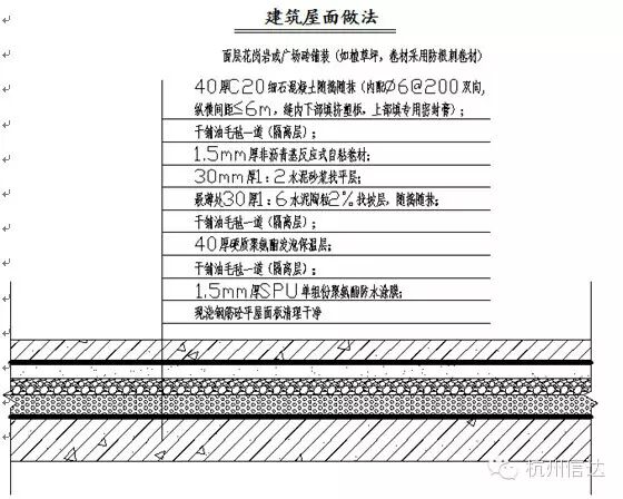 为了满足屋面的基本功能,屋面应设有防水层、保温层等。我们现在看到的是武林壹号的建筑屋面做法的剖面图,一共是九道工序,我们按照施工顺序进行逐层了解。