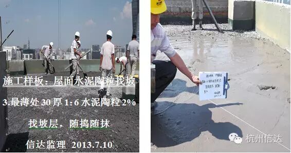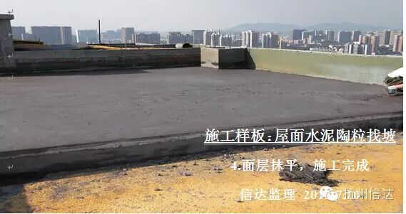 按照设计要求的2%的坡度,向雨水口找坡,在女儿墙和其他突出屋面的墙体上弹出找坡层上平标高线和控制线。同时要求施工方根据水落口的位置和坡度,设置好灰饼,用于实时控制找坡层的上表面标高。