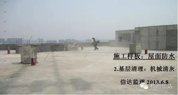 每道工序施工前,都需要先进行基层清理。在保温层施工前,还需要干铺一道油毛毡,作为隔离层,同时也是保护层,避免防水涂料层被破坏。