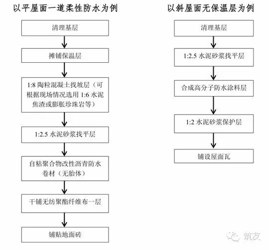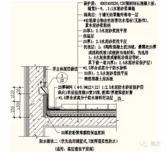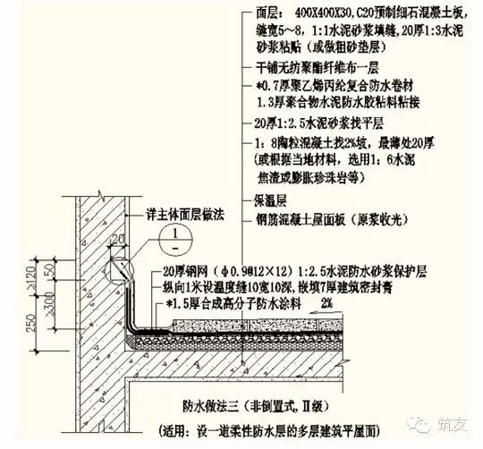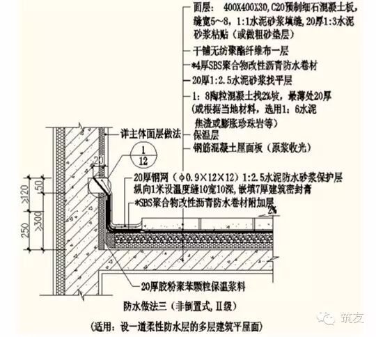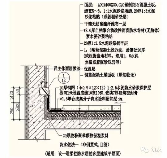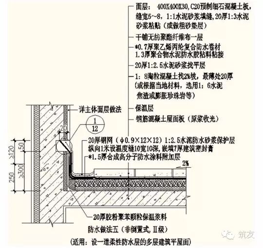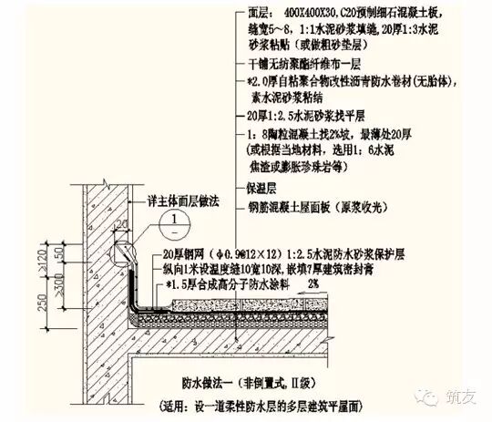 1、屋面防水做法一(非倒置式,Ⅱ级,适用: 设一道柔性防水多层建筑平屋面)