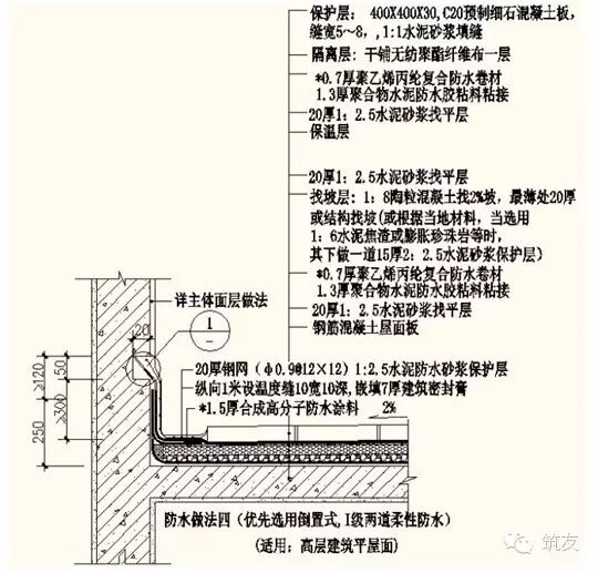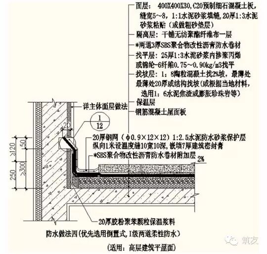 4、屋面防水做法四(优先选用倒置式,Ι级两道柔性防水,适用:高层建筑平屋面)