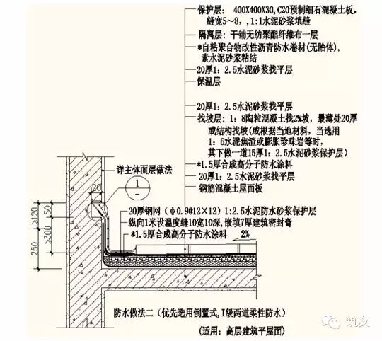 2、屋面防水做法二(优先选用倒置式,Ι级两道柔性防水,适用:高层建筑平屋面)