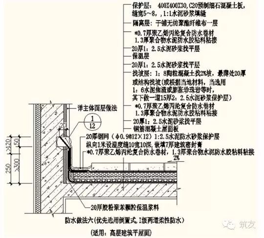 6、屋面防水做法六(优先选用倒置式,Ⅰ级两道柔性防水,适用:高层建筑平屋面)