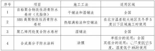 2、屋面的保温层和防水层严禁在雨天、雪天和五级风及其以上时施工。屋面防水层施工工法和适用区域要求如下表: