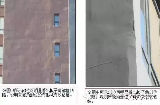 劣质粘结砂浆导致的外墙外保温层脱落,断裂面在粘结砂浆面在中间。如下图所示