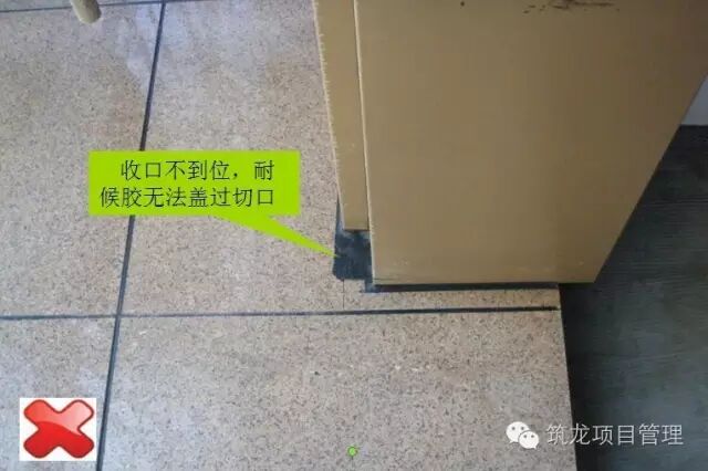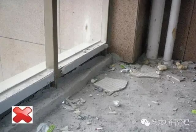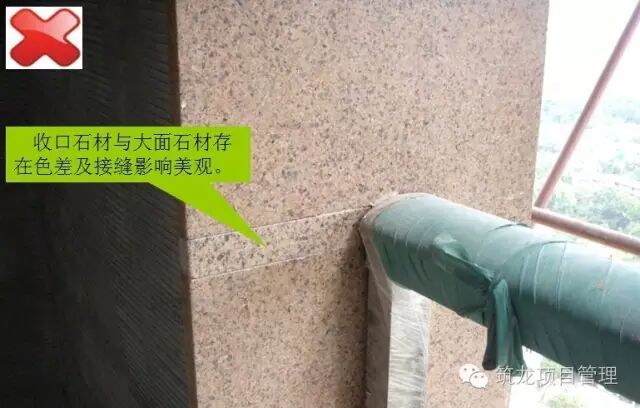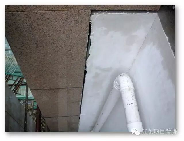栏杆及石材幕墙安装前,阳台的砼翻口挡水应先行施工到位,否则造成上图中,工序颠倒引起的不合格翻口施工,上下层间存在渗漏隐患。