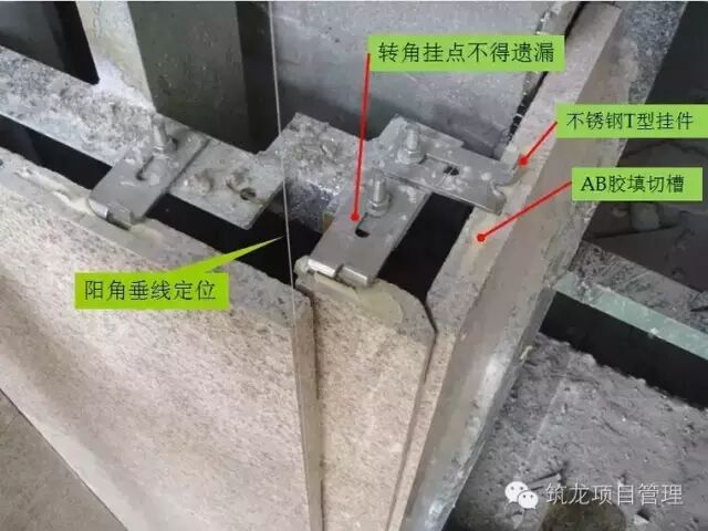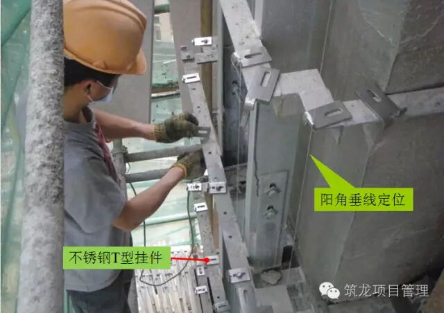 石材安装前做好准备工作,阳角吊线控制石材定位,预装T型不锈钢连接码件。