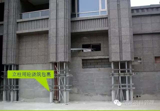 石材幕墙钢架落地主要受力槽钢立柱应用砼浇筑包裹,保证回填后耐久性。