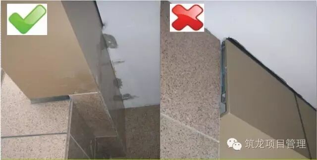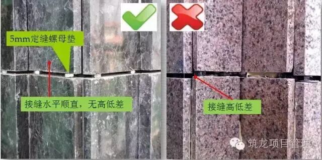 石材安装应保证接缝6mm,并保持顺直,特别是相邻阴阳角的两边接缝不能有高低差,否则直接影响打胶收口的观感质量。定缝垫块应离开石材表面,往缝内放,保证为接缝施胶作业留足空间。