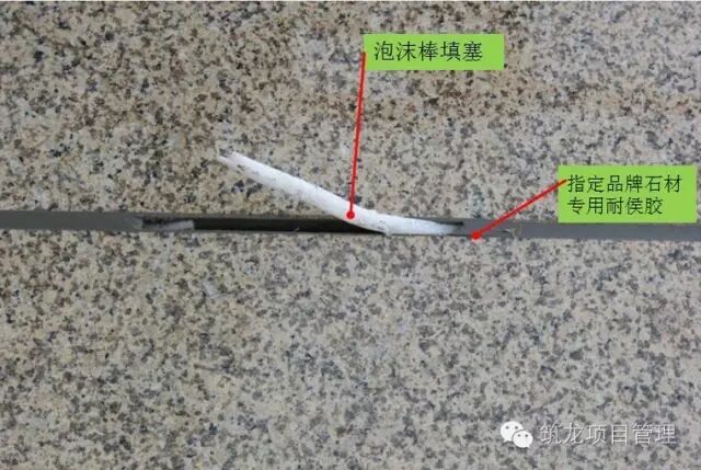 石材接缝应在表面卫生清理后,两边贴美纹纸控制缝宽,保证打胶顺直,石材拼缝内填塞泡沫棒,胶厚度控制在3mm以上。