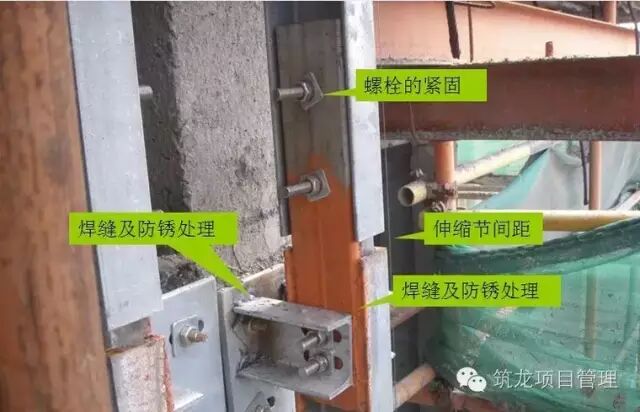 立柱安装由底层安装开始,由下及上安装,第一道安装定位放线尤其重要。通过水平拉线通视及吊垂线通视定位,先点焊,待拉线及吊线校正后,再满焊,紧固螺栓固定。
