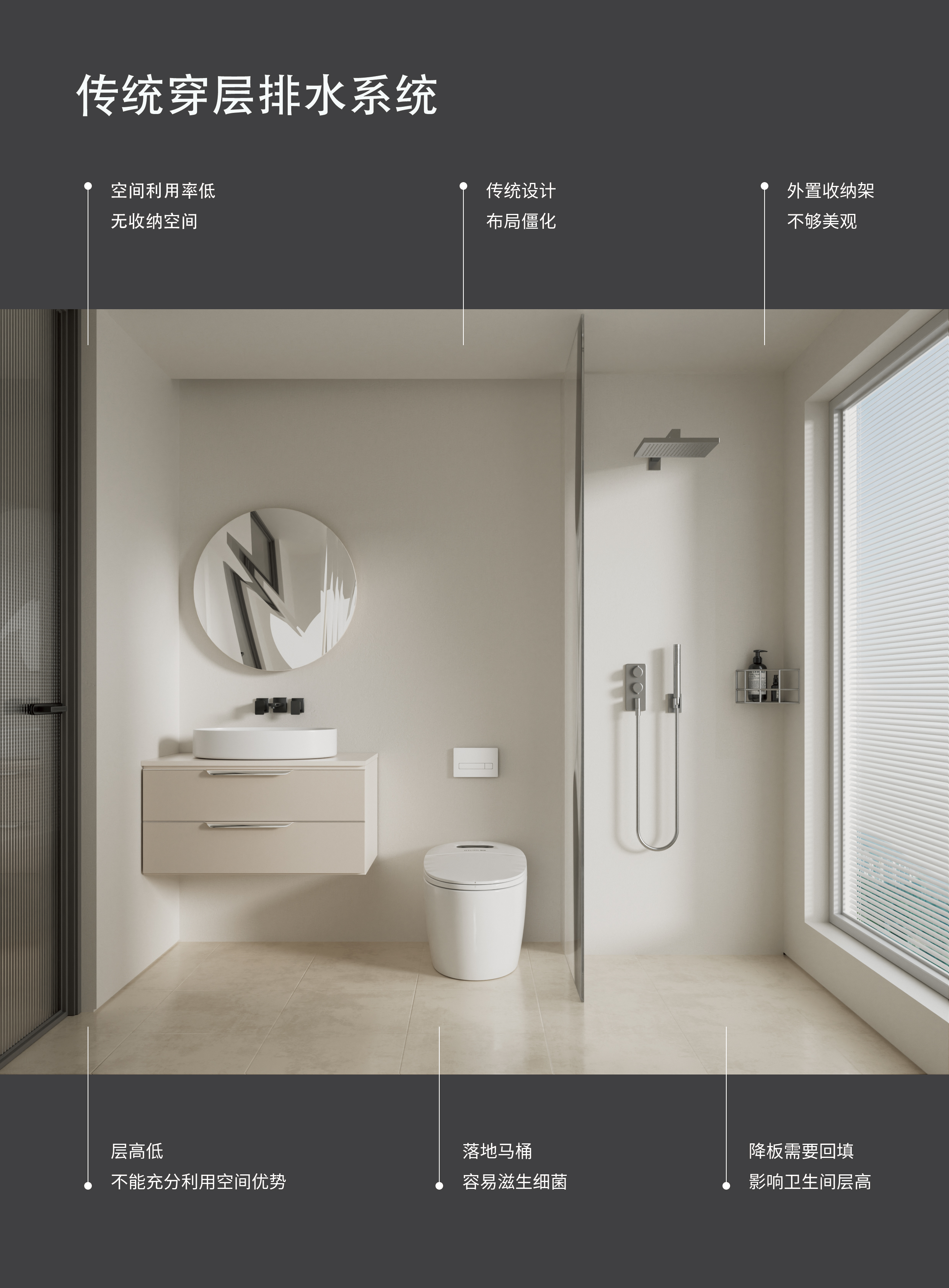 海瑞斯同层排水系统,彻底摒弃了传统的大降板(350-400mm)模式。